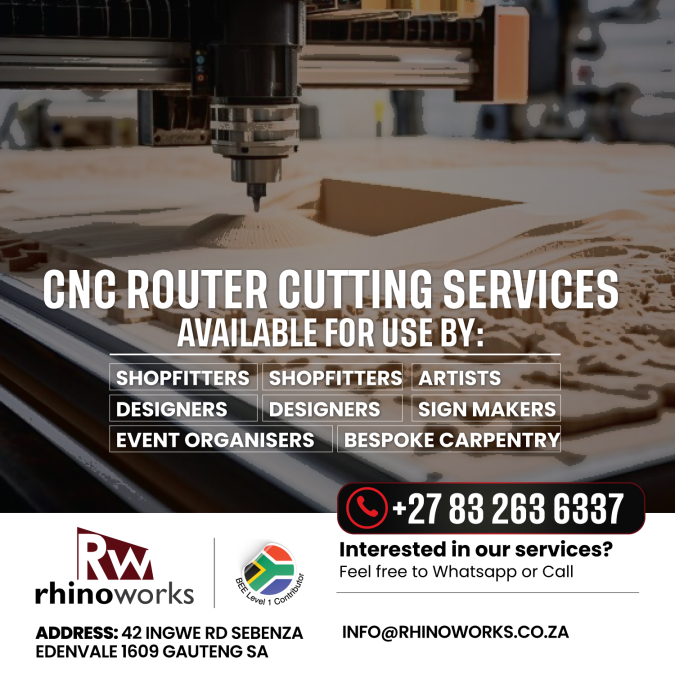 Get in Touch with us to Speak with our design team +27 83 263 6337 today and let us help you with any of your CNC, Laser or Fibre cutting projects! Orders can also be placed via Email: info@rhinoworks.co.za. Visit our News Page to keep up to date with more exclusive details about Rhinoworks